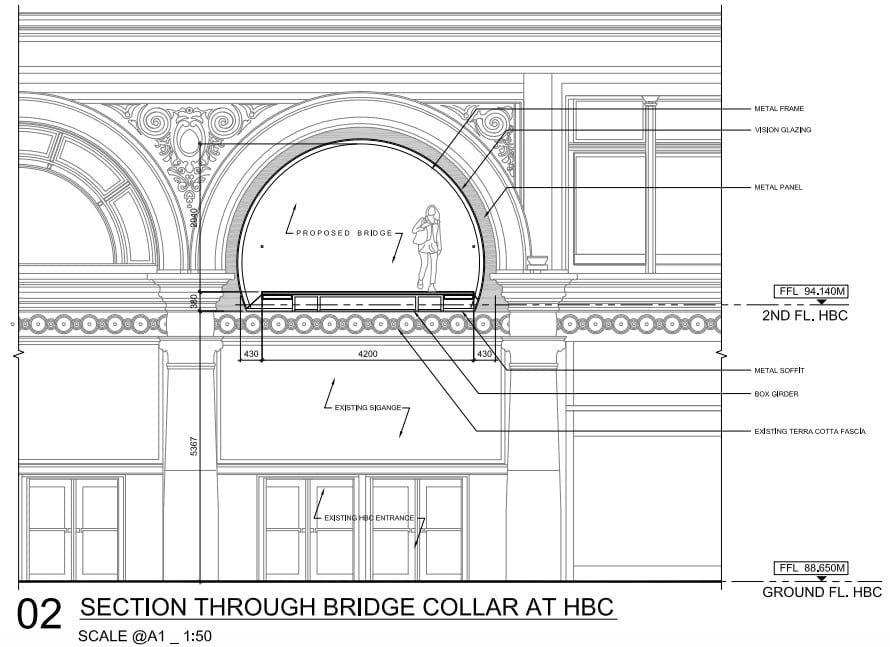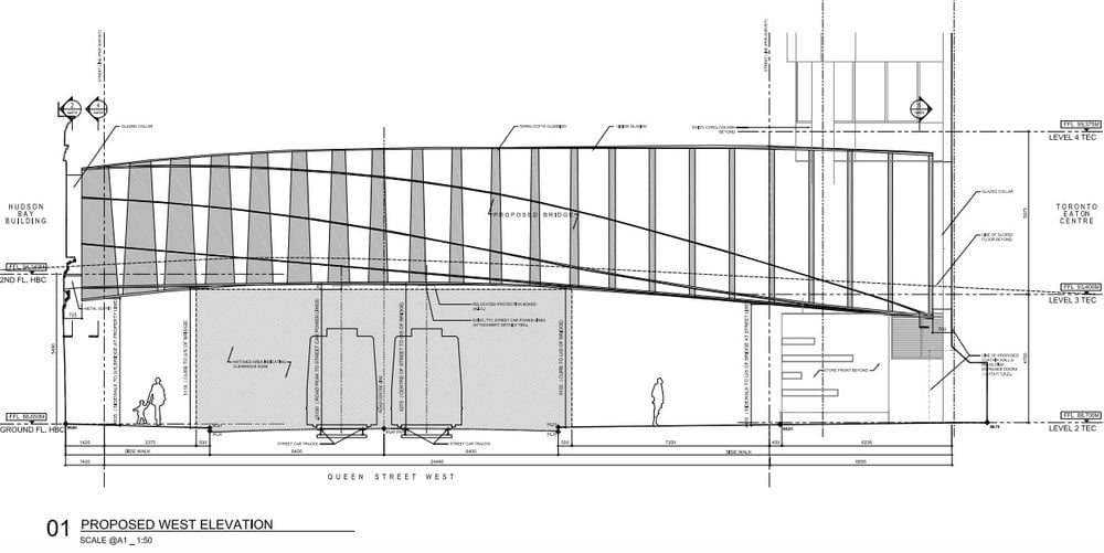 Cadillac Fairview held an international design competition, and London UK-based design firm WilkinsonEyre was selected to design the walkway that will feature glass and etched bronze cladding panels that will span the walkway. The bronze cladding widens at the south end toward the Hudson’s Bay/Saks building.