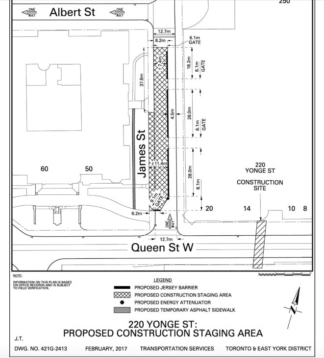 For minimal disruption, the bridge will be pre-assembled adjacent to CF Toronto Eaton Centre on James Street, and will be lifted into place once complete. At the same time, the City of Toronto is laying down new streetcar tracks along Queen Street West.